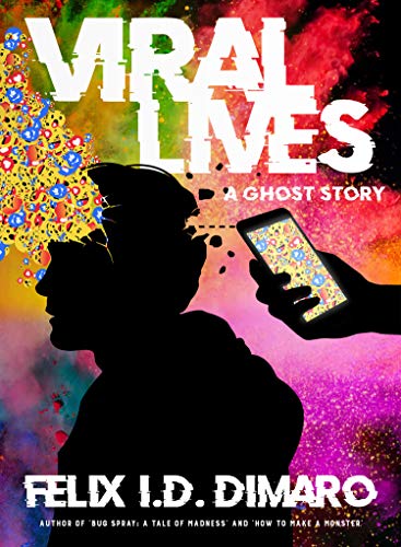 Book cover for Viral Lives by Felix I.D. Dimaro. Image on cover is a drawing of two silhouttes of people. The person on the left is holding a cellphone whose screen is filling with hundreds of coloured flecks. Only that person’s arm and a small portion of their head is visible. The second silhoutte shows a person sitting down. The back of their skull has small pieces of skull shooting out from it as if the cellphone shot them in the head. The front of their skull is exploding, and hundreds more coloured flecks are shooting straight out and up from it to the left.