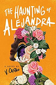 Book cover for The Haunting of Alejandra by V. Castro. Image on cover shows a photograph of the side view of a young Mexican woman’s face as she stands looking to the left. Her neck, head, forehead, and cheek have pink, red and flowers and their leaves covering them so completely you cannot see her skin or clothing. The vast majority of the flowers are roses, some large and some small. There is also a daisy and some tiny white flowers I can’t identify.
