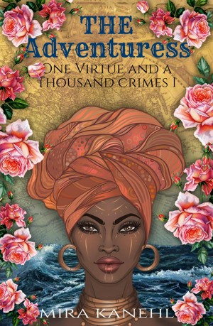 Book cover for The Adventuress Series: One Virtue and a Thousand Crimes, Book 1 by Mira Kanehl. Image on cover is a painting of a beautiful brown-skilled woman who is wearing an orange scarf over her thick hair that has been in turn piled on top of her head. She is also wearing gold hoop earrings and is surrounded by pink roses in this image.