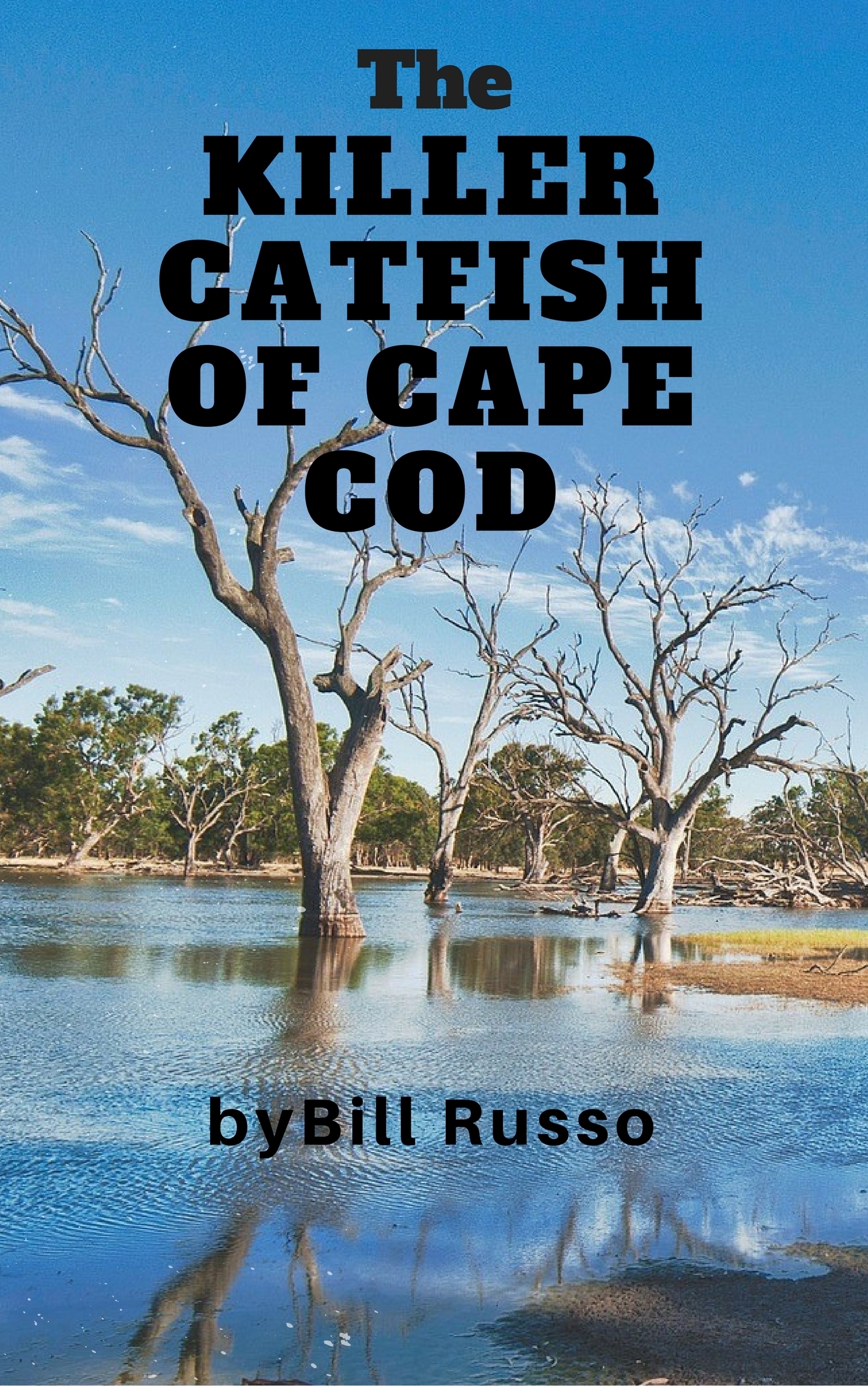 Book cover for The Killer Catfish of Cape Cod by Bill Russo. Image on cover shows a few dead trees in a flooded area that could be a swamp or the overflow area for a river. The sky above the trees is blue with a few puffy white clouds in them, and you can see a forest of healthy trees in the distance. The water looks like it has been recently disturbed as it is not perfectly still.